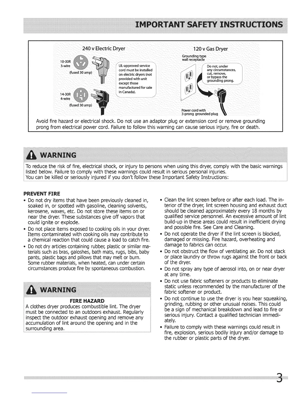 To reduce the risk of fire, electrical shock, or injury to persons when using this dryer, comply with the basic warnings