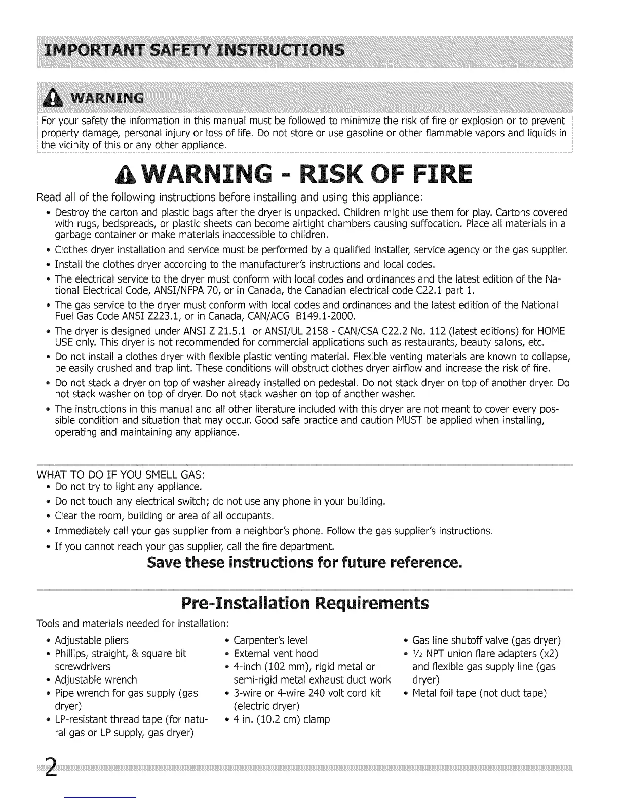 Clothes dryer installation and service must be performed by a qualified installer, service agency or the gas supplier.