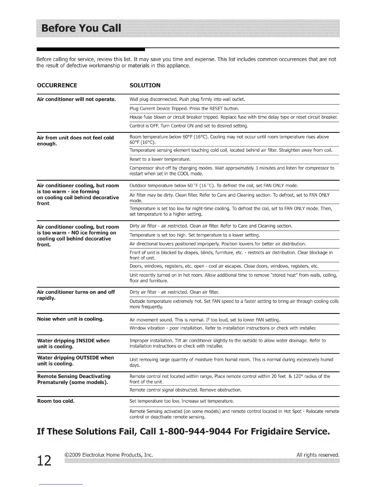 If These Solutions Fail, Call 1=800-944=9044 For Frigidaire Service,