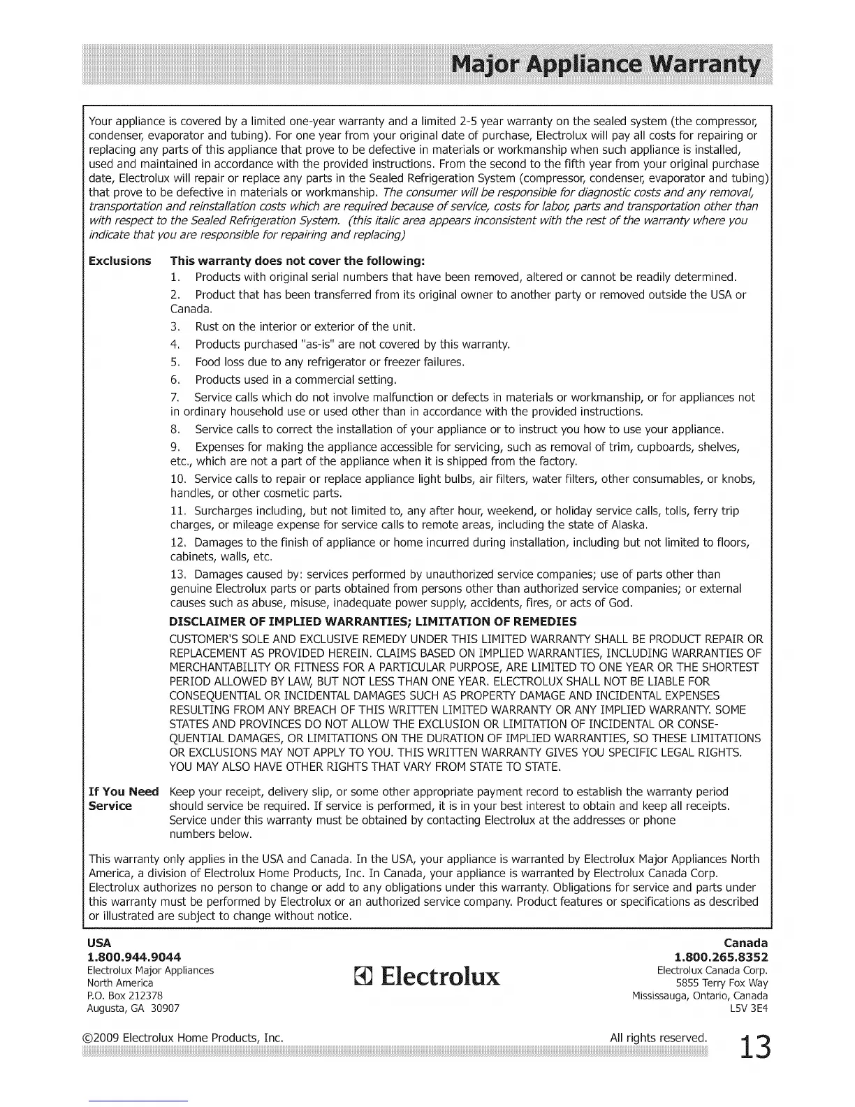 America, a division of Electrolux Home Products, Inc. In Canada, your appliance is warranted by Electrolux Canada Corp.