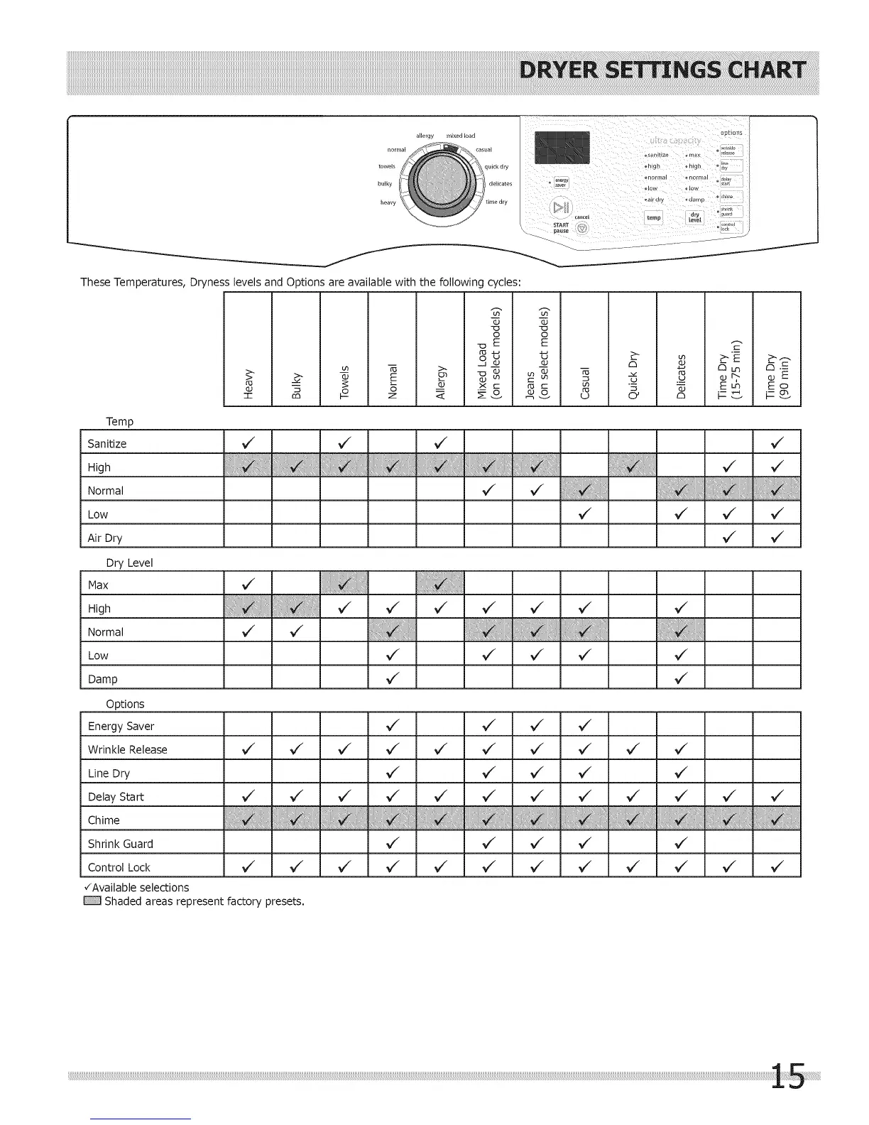 These Temperatures, Dryness levels and Options are available with the following cycles: