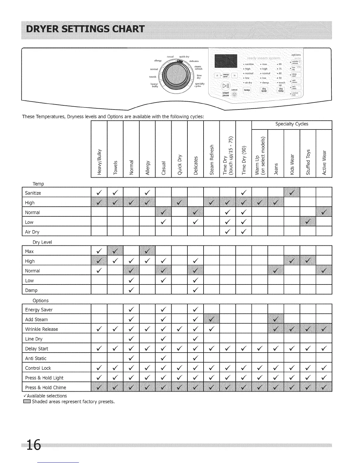 These Temperatures, Dryness levels and Options are available with the following cycles:
