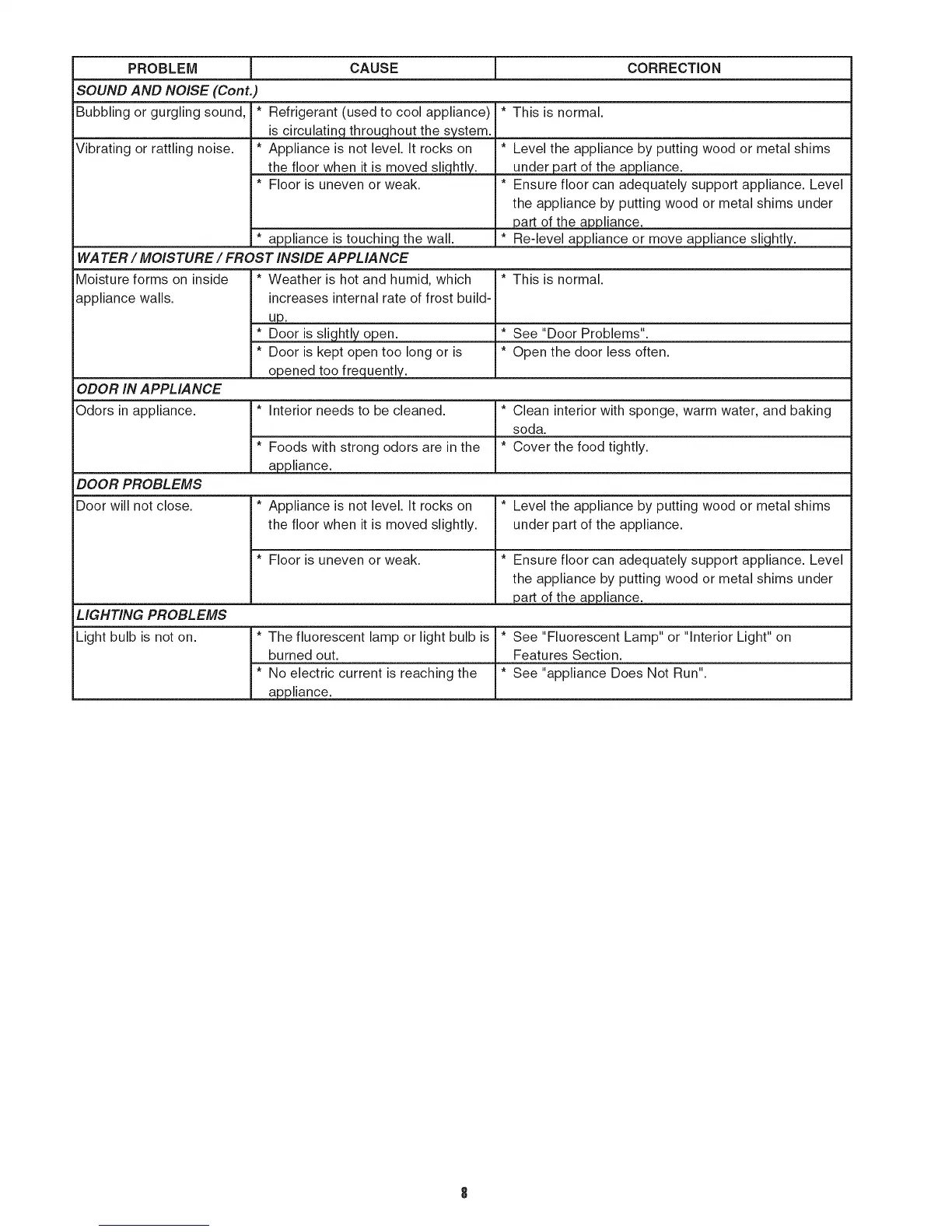 Door will not close. * Level the appliance by putting wood or metal shims