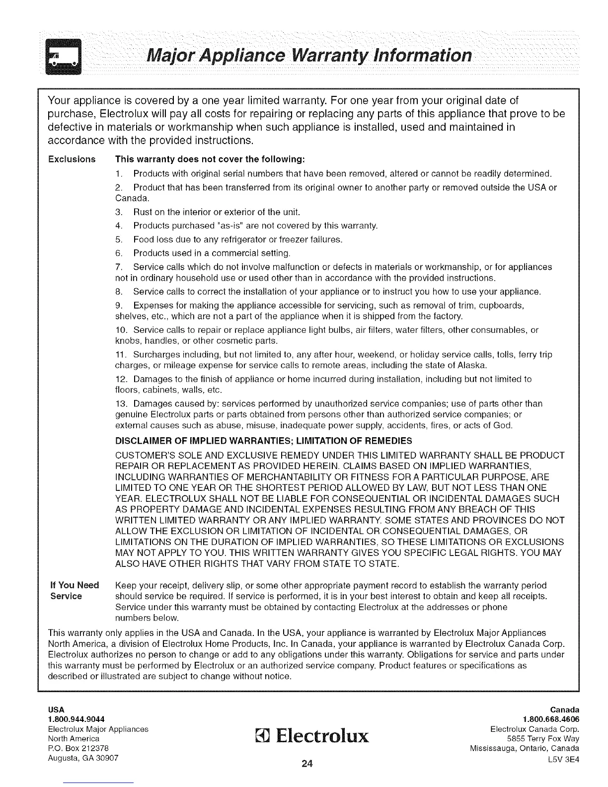 North America, a division of Electrolux Home Products, Inc. In Canada, your appliance is warranted by Electrolux Canada Corp.