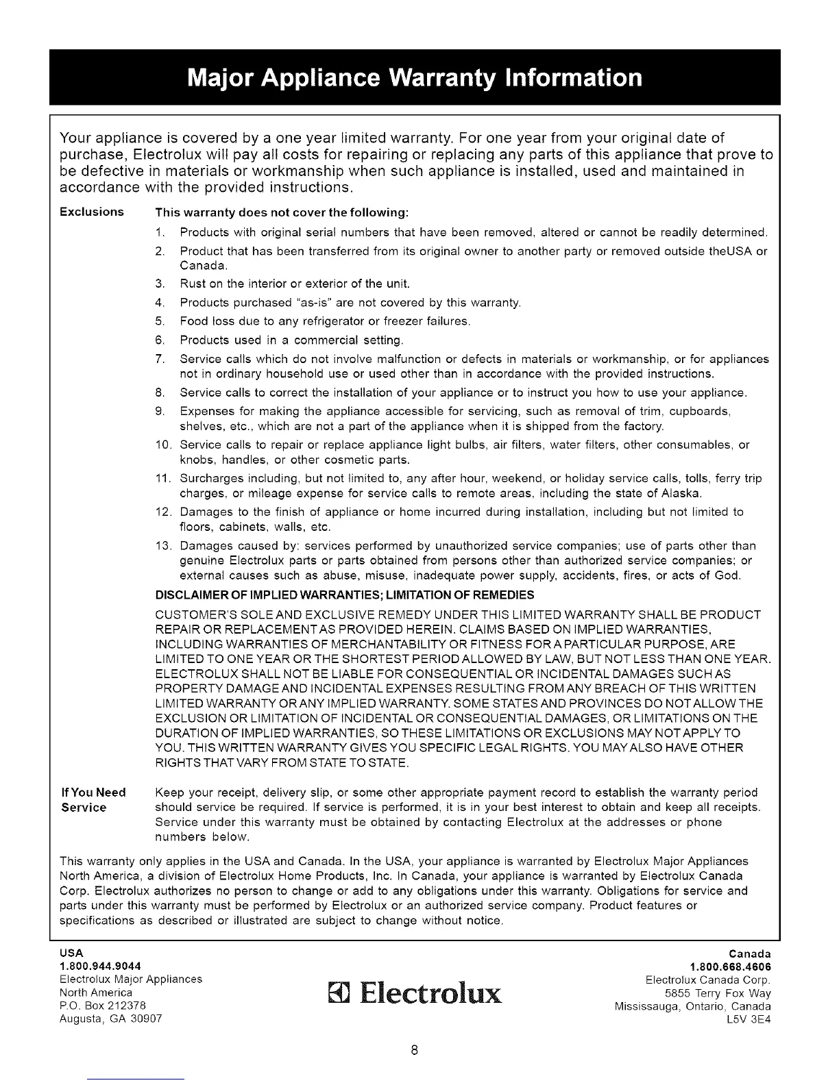 North America, a division of Electrolux Home Products, Inc. In Canada, your appliance is warranted by Electrolux Canada