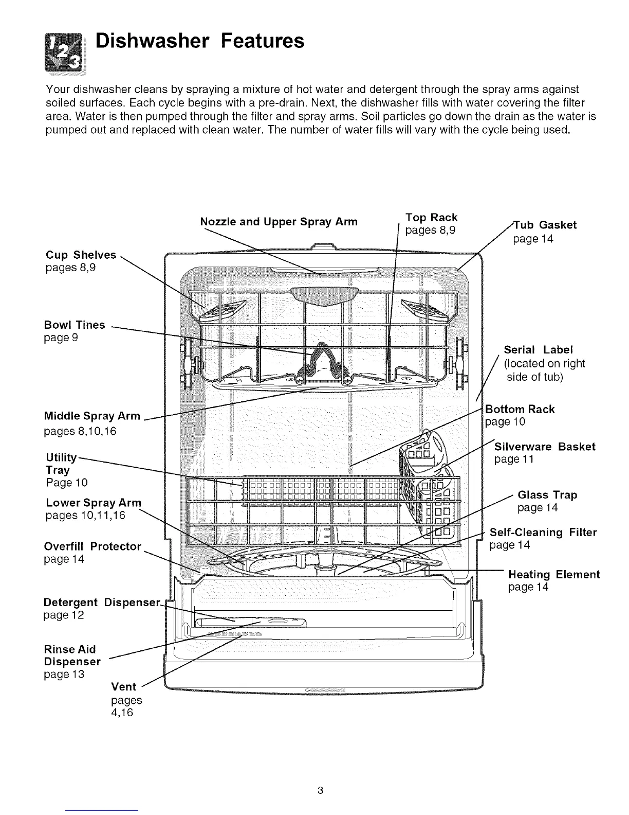 soiled surfaces. Each cycle begins with a pre-drain. Next, the dishwasher fills with water covering the filter