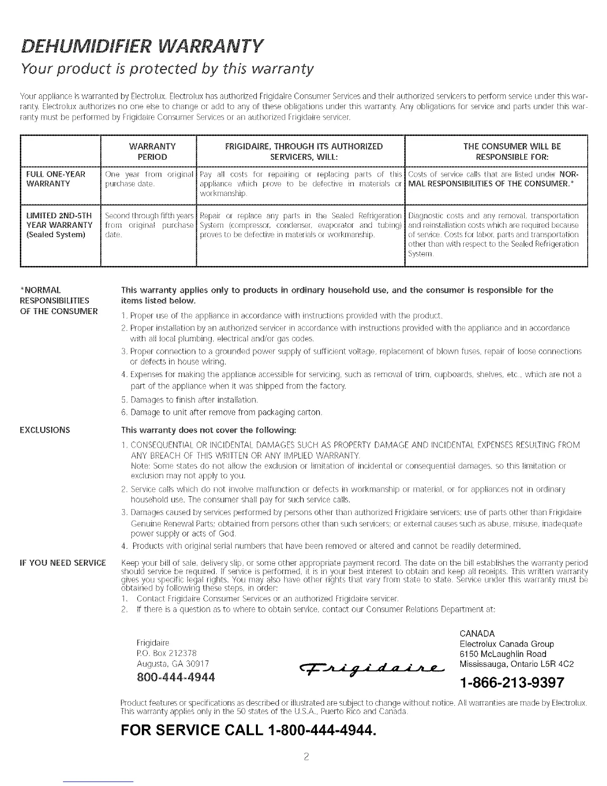 WARRANTY FRIGIDAIRE, THROUGH ITS AUTHORIZED THE CONSUMER WILL BE