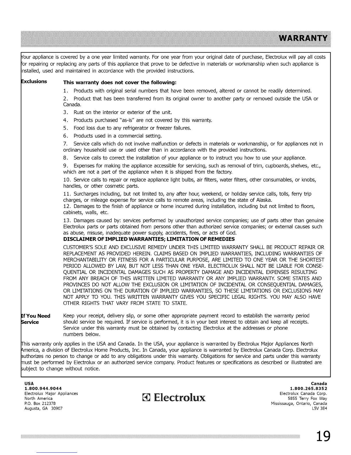 \merica, a division of Electrolux Home Products, Inc. In Canada, your appliance is warranted by Electrolux Canada Corp. Electrolux
