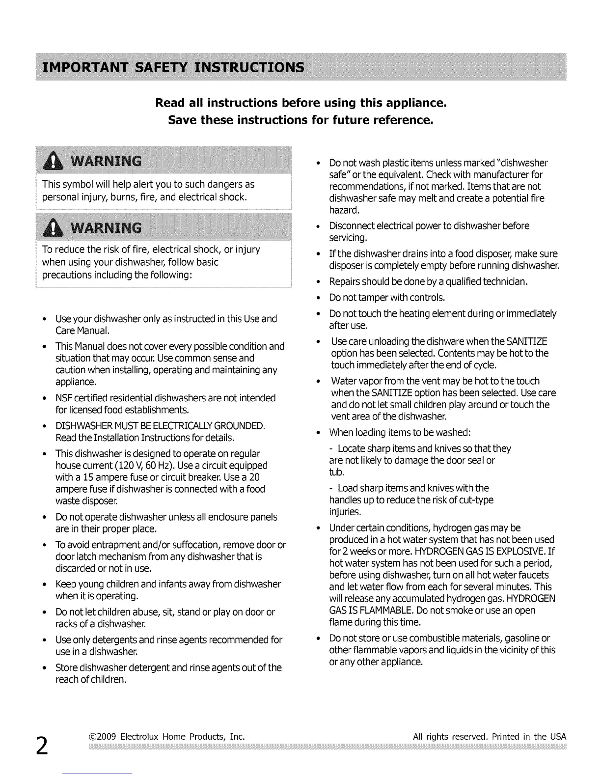 @2009 Electrolux Home Products, Inc. All rights reserved. Printed in the USA