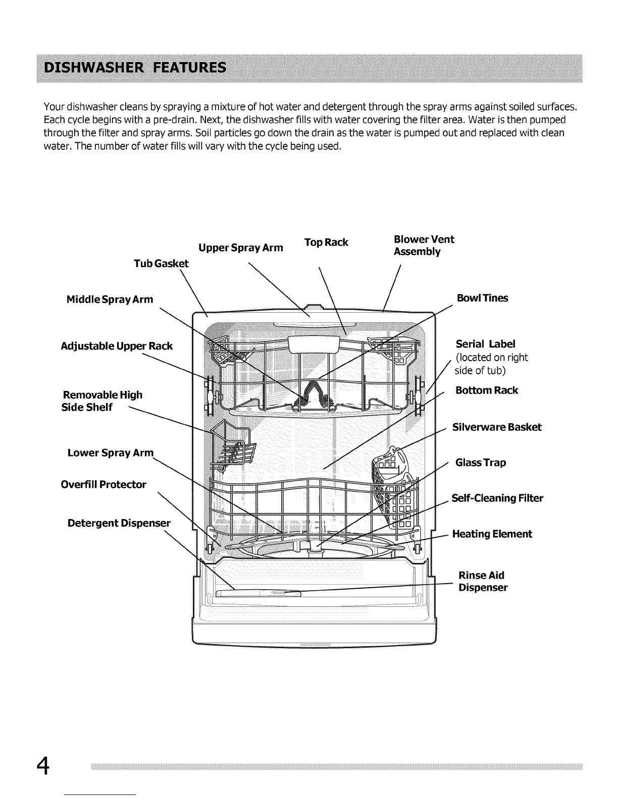 Your dishwasher cleans by spraying a mixture of hot water and detergent through the spray arms against soiled surfaces.