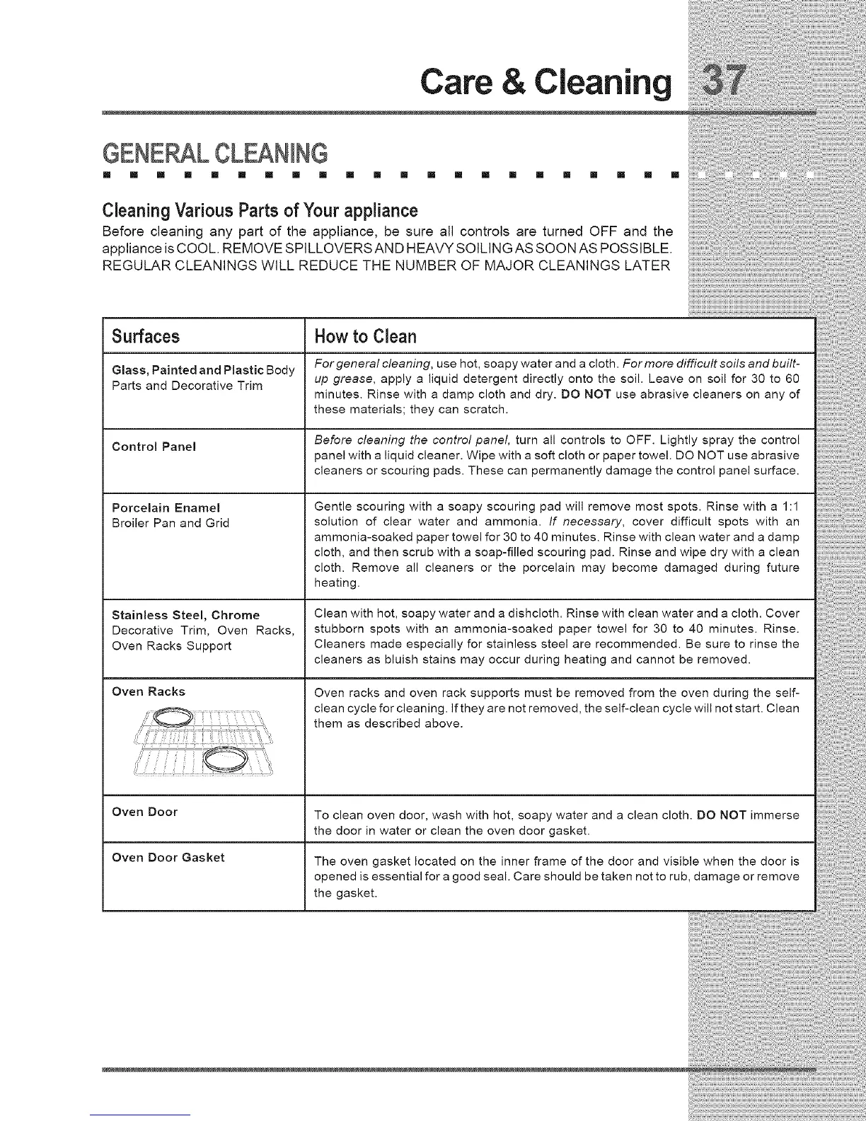 Glass, Painted and Plastic Body Forgeneral cleaning, use hot, soapy water and a cloth. Formore difficult soils and built-
