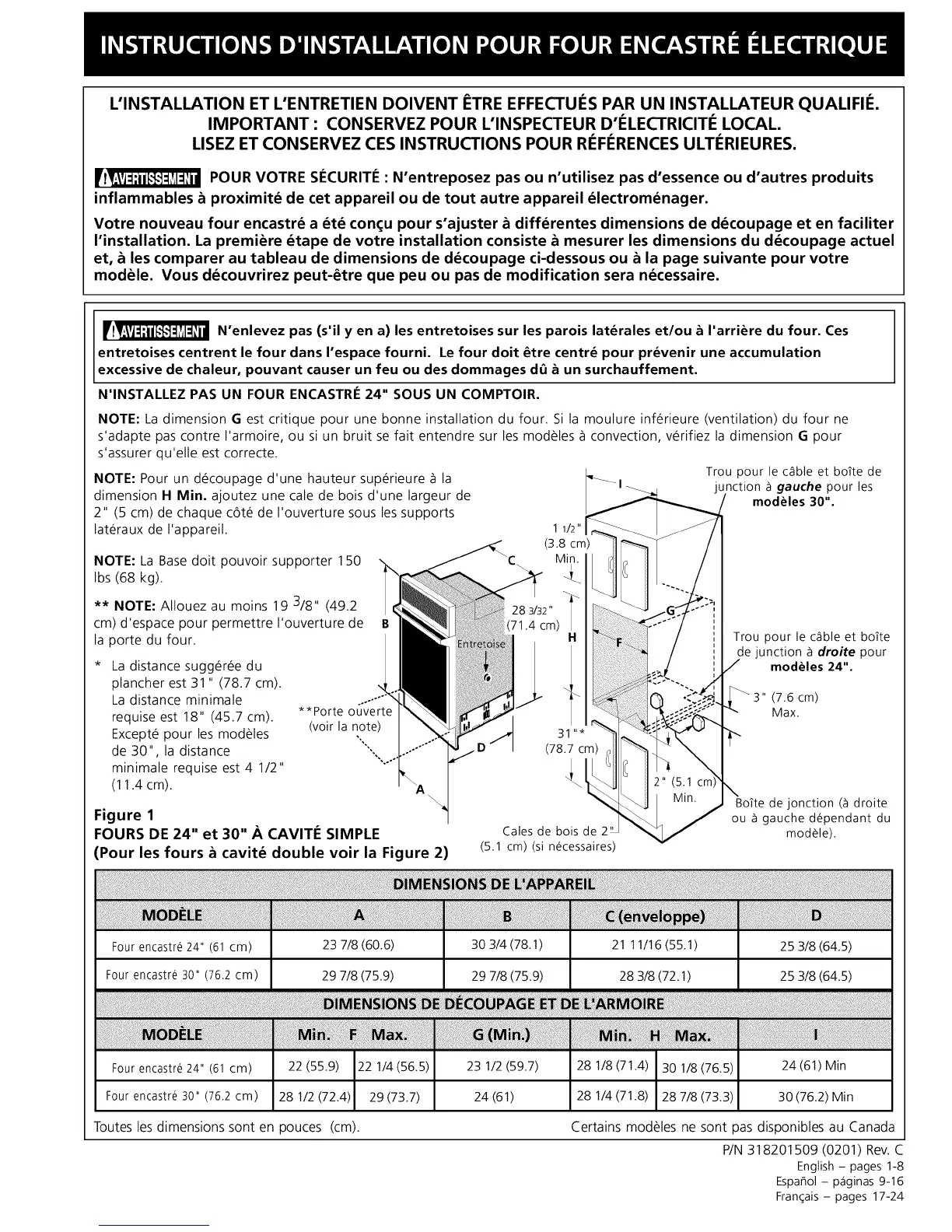 NOTE: La dimension G est critique pour une bonne installation du four. Si la moulure inferieure (ventilation) du four ne