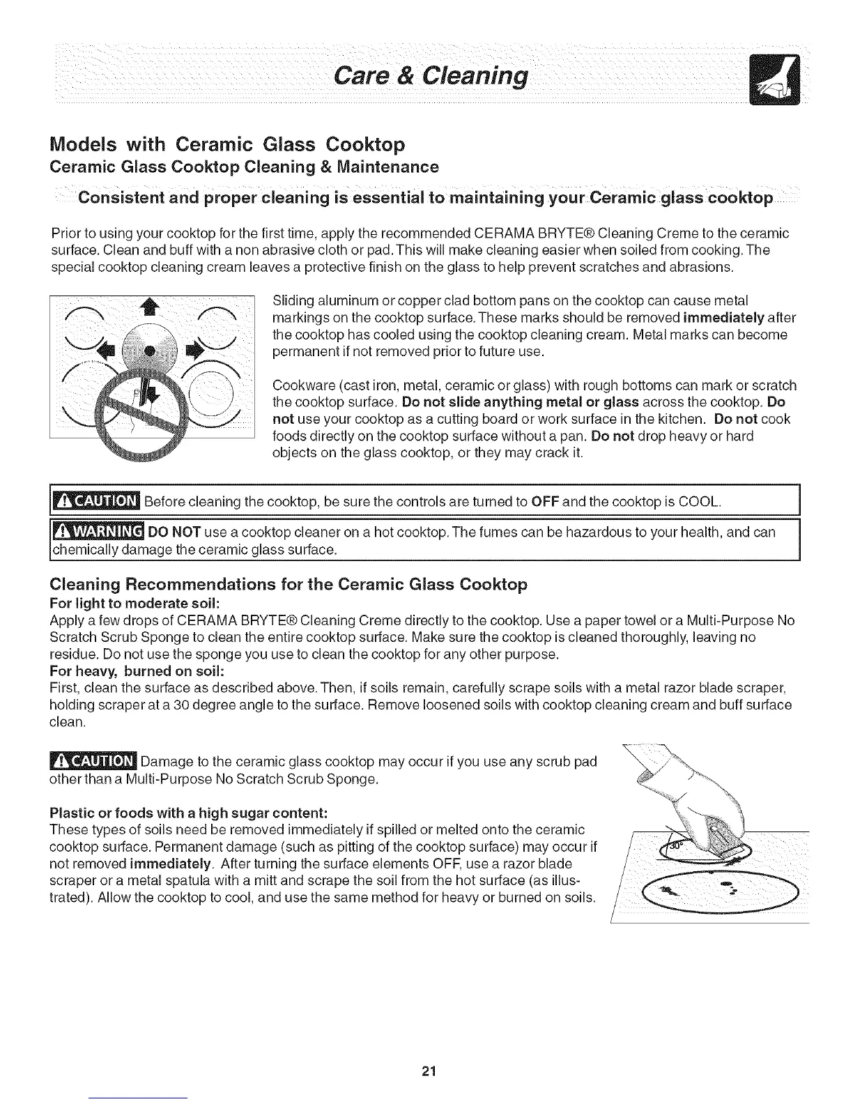 holding scraper at a 30 degree angle to the surface. Remove loosened soils with cooktop cleaning cream and buff surface