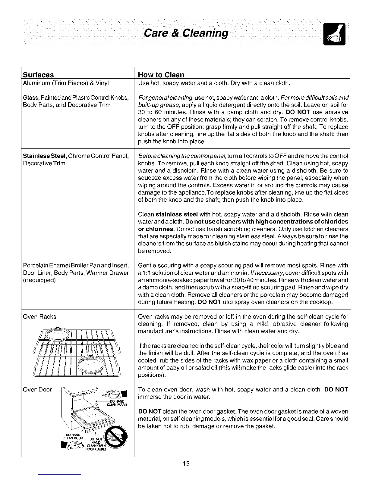 Forgeneralcleaning, use hot, soapy water and a cloth. Formore difficultsoils and