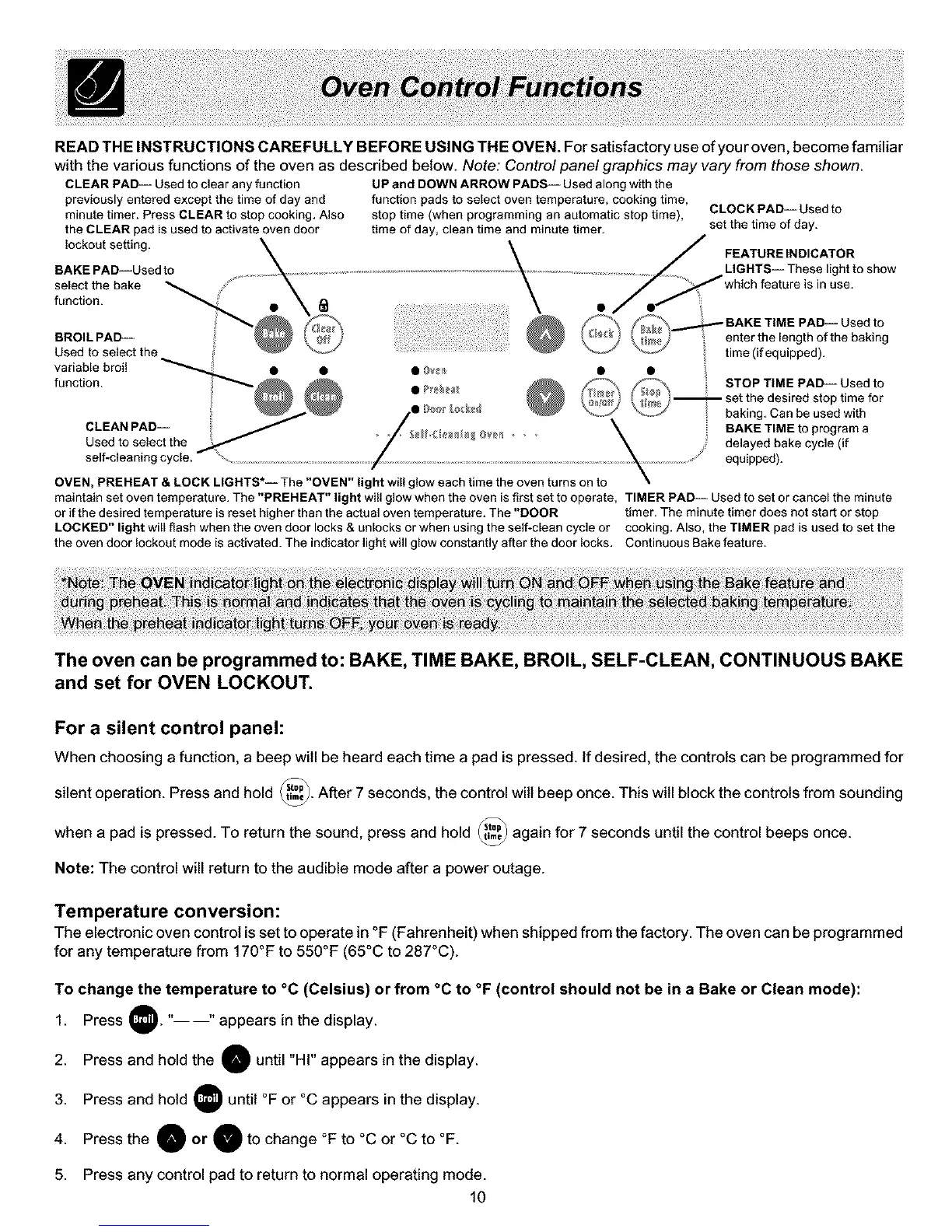 The electronic oven control is set to operate in °F (Fahrenheit) when shipped from the factory. The oven can be programmed