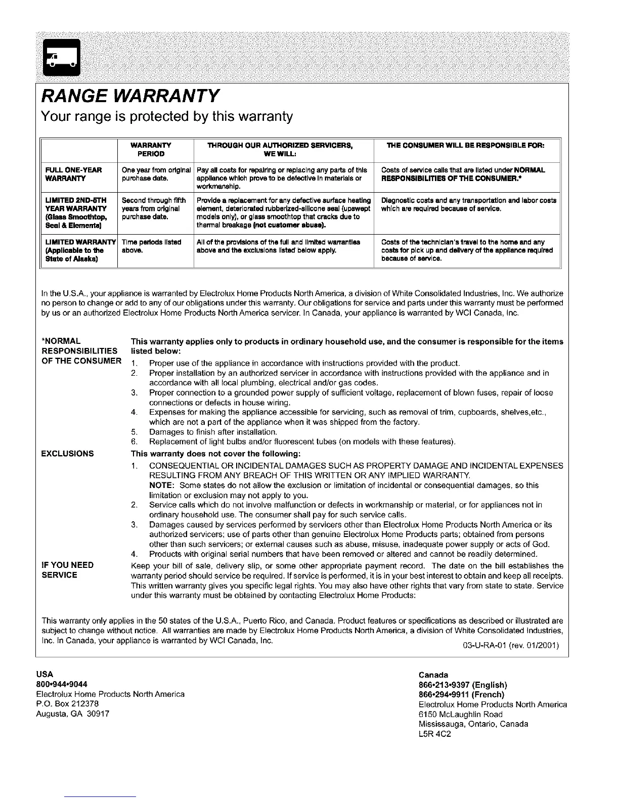 Inc. In Canada, your appliance is warranted by WCl Canada, Inc. 03-U-RA-01 (rev. 01/2001)