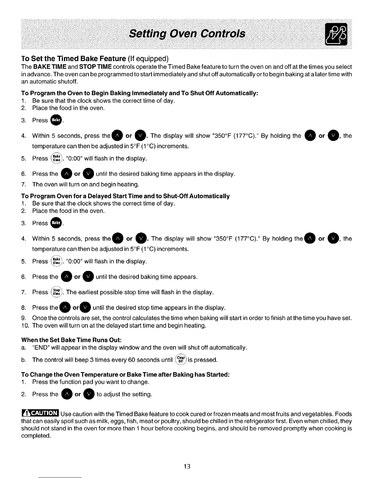 Use caution with the Timed Bake featu re to cook cu red or frozen meats and most fruits and vegetables. Foods