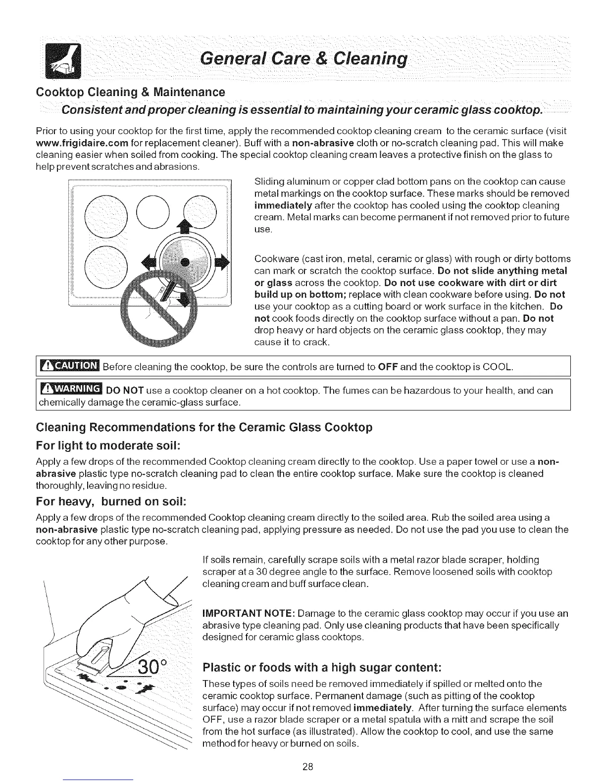 scraper at a 30 degree angle to the surface. Remove loosened soils with cooktop