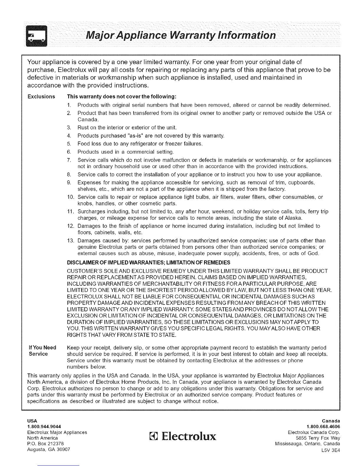 Service under this warranty must be obtained by contacting Electrolux at the addresses or phone