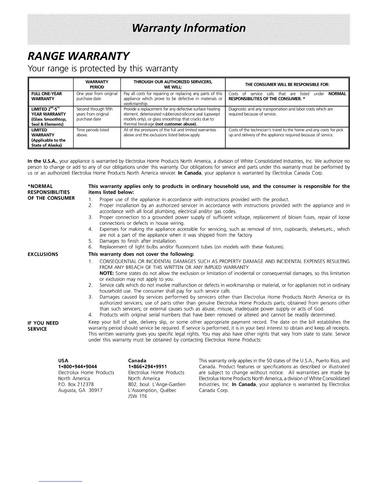 us or an authorized Electrolux Home Products North America servicer. In Canada, your appliance is warranted by Electrolux Canada Corp.