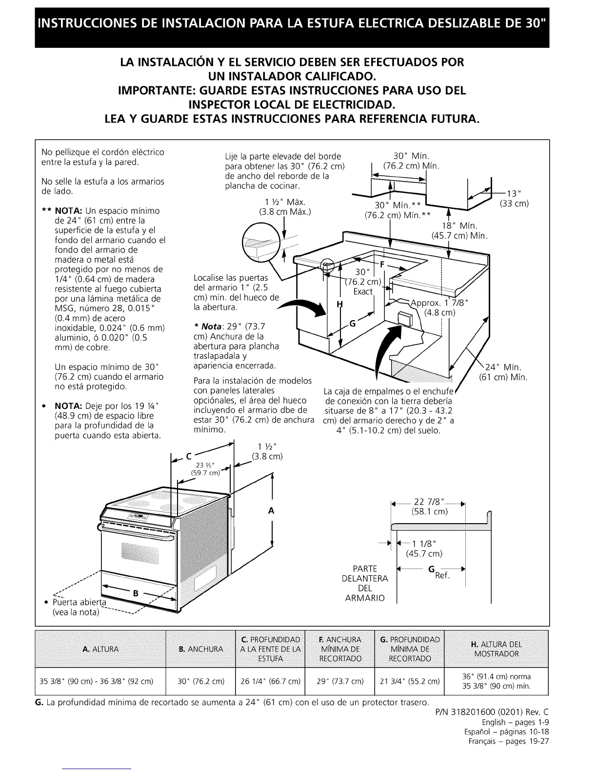 G. La profundidad minima de recortado se aumenta a 24" (61 cm) con el uso de un protector trasero.