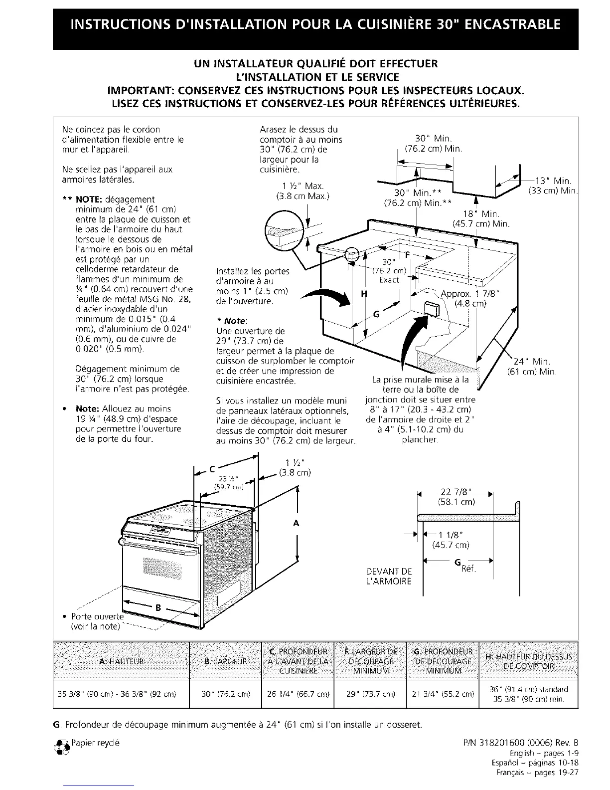 G. Profondeur de decoupage minimum augmentee a 24" (61 cm) si I'on installe un dosseret.