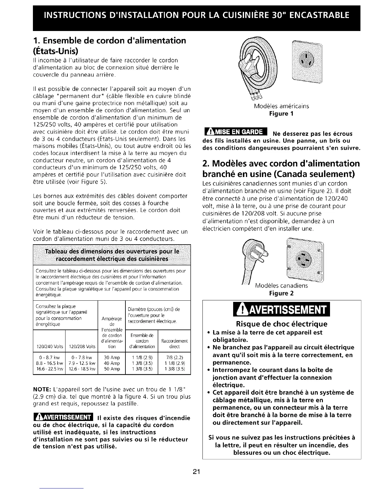 cuisinieres de 120/208 volt. Si aucune prise