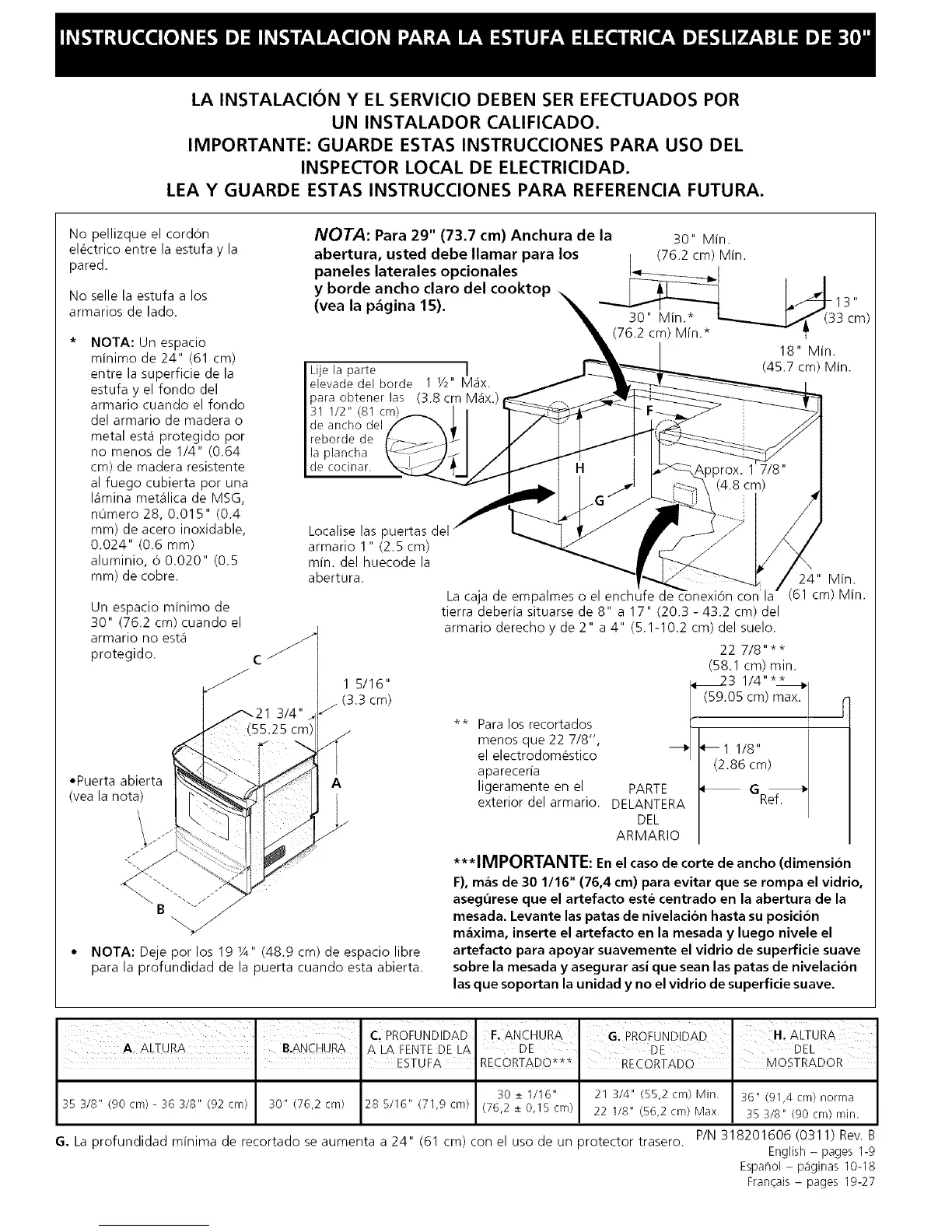 G. La profundidad minima de recortado se aumenta a 24" (61 cm) con el uso de un protector trasero.