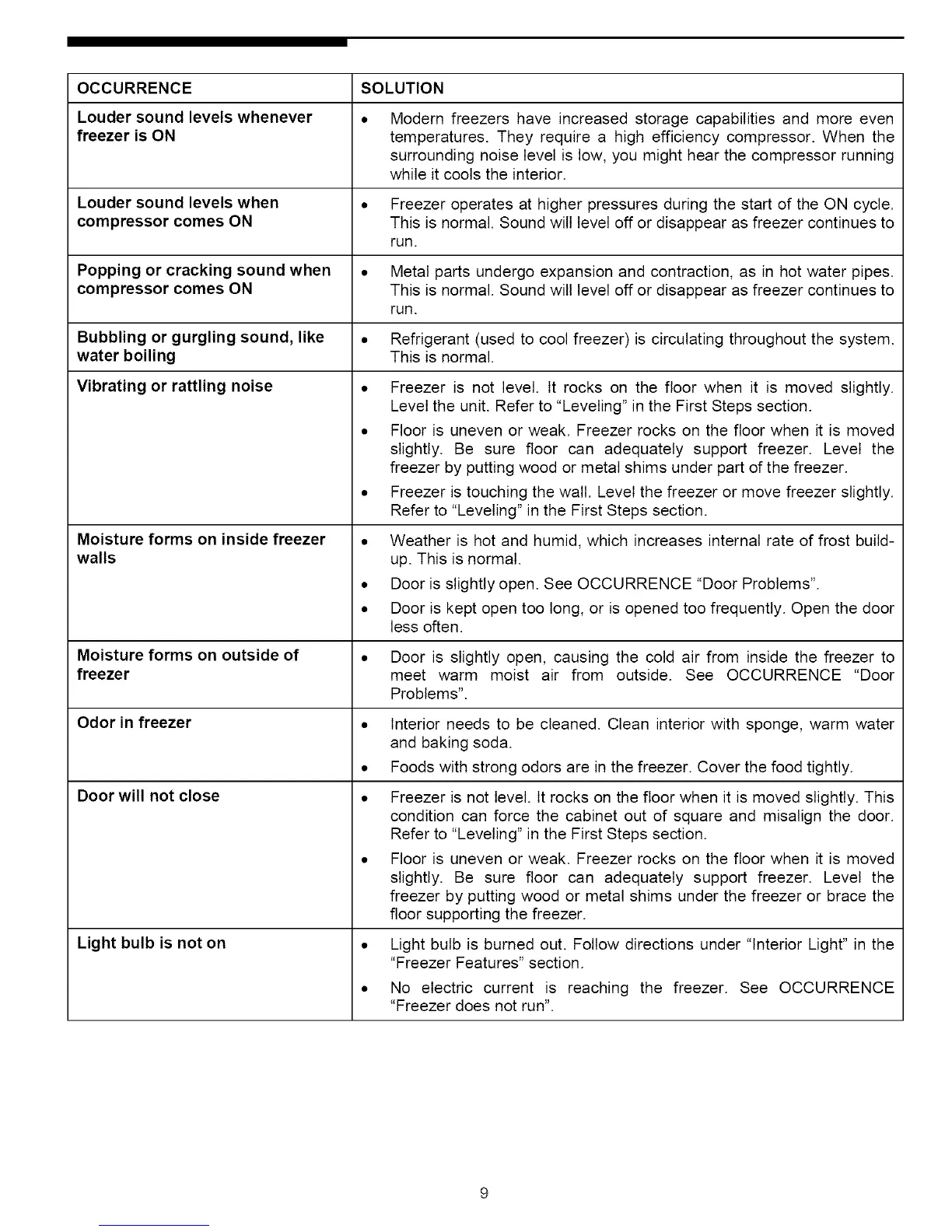 • Freezer is not level, tt rocks on the floor when it is moved slightly.