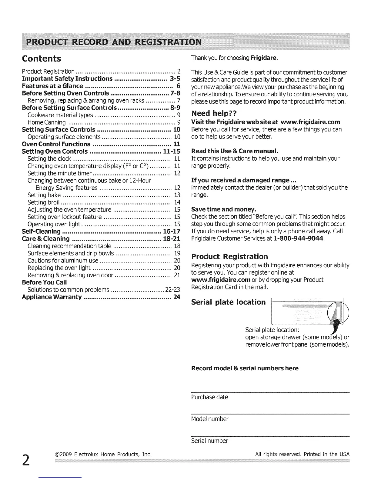 @2009 Electrolux Home Products, Inc. All rights reserved. Printed in the USA