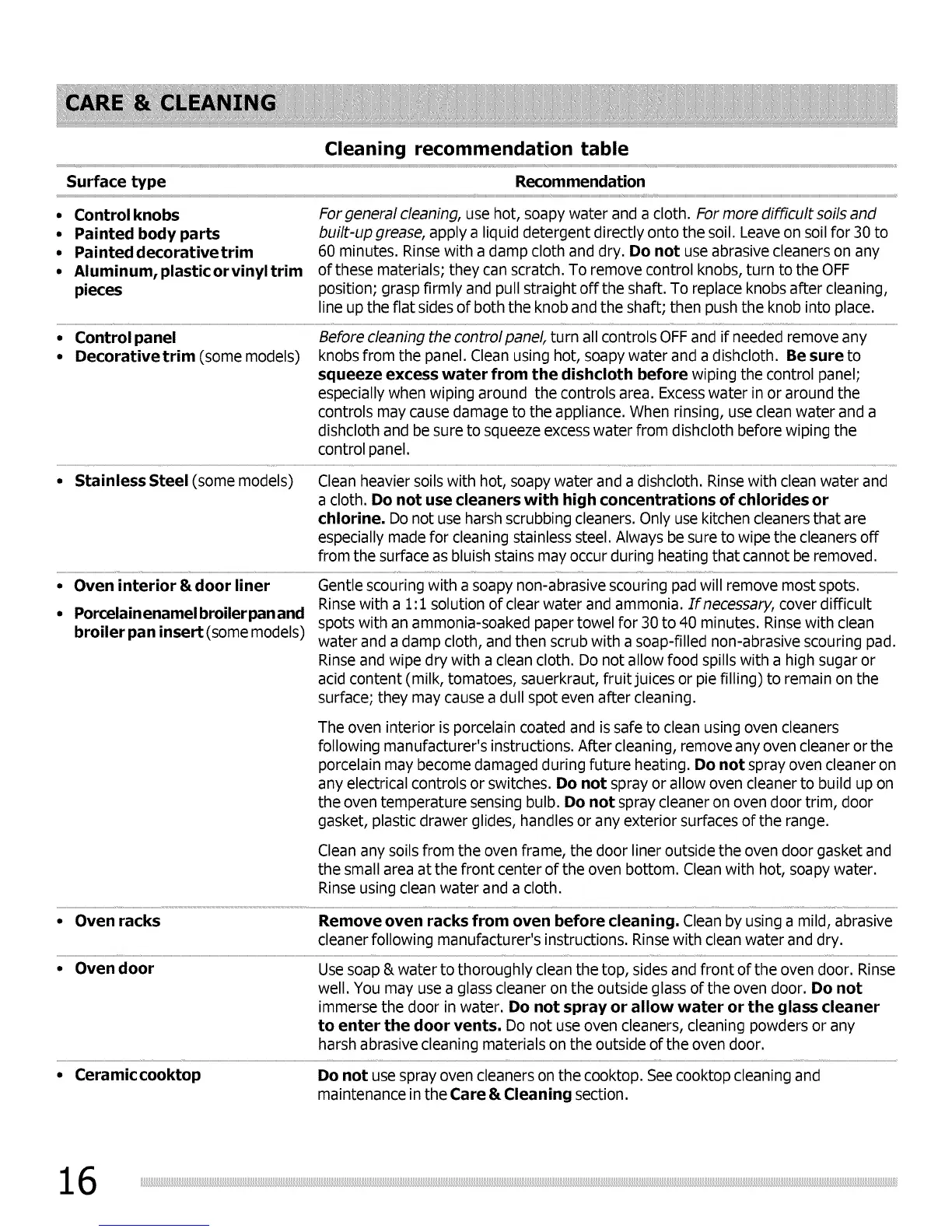 Control knobs For general cleaning, use hot, soapy water and a cloth. For more difficult soils and