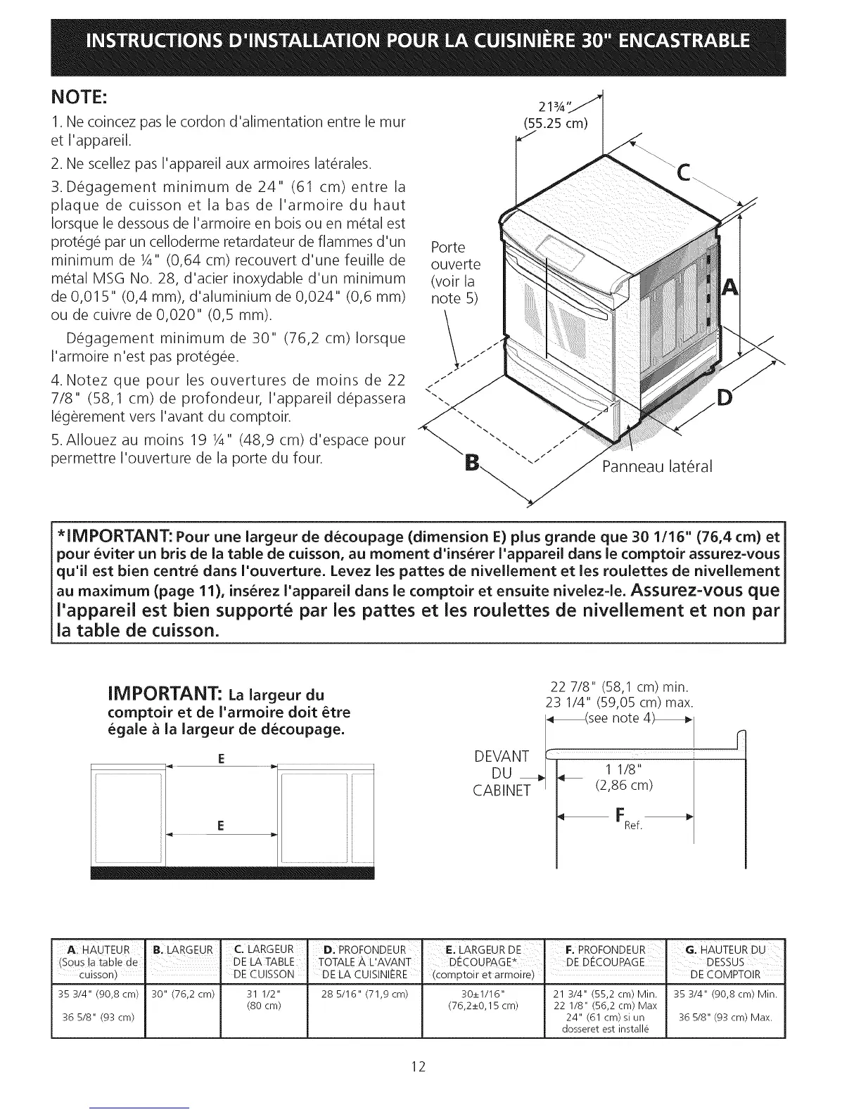 *IMPORTANT: Pour une largeur de d_coupage (dimension E) plus grande que 30 1116" (76,4 cm) et