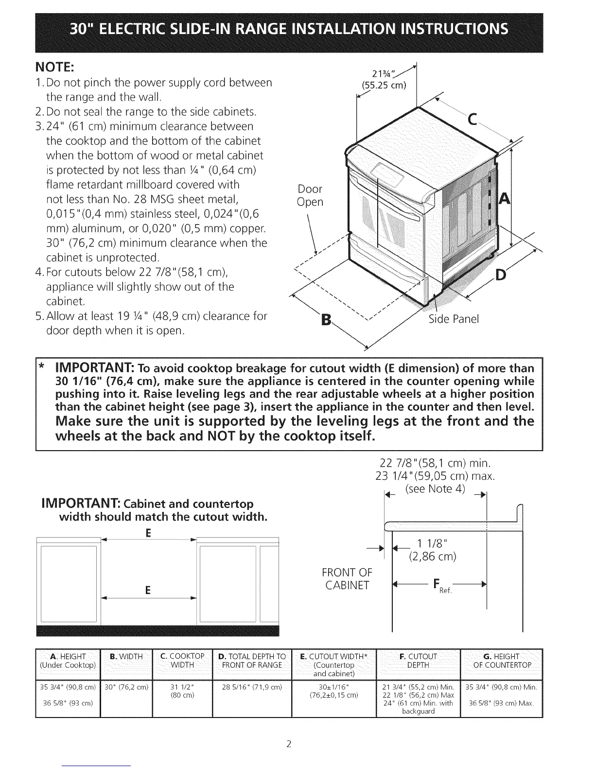 IMPORTANT: To avoid cooktop breakage for cutout width (E dimension) of more than