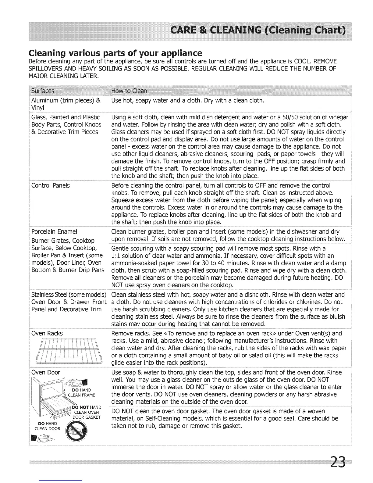 models), Door Liner, Oven ammonia=soaked paper towel for 30 to 40 minutes. Rinse with clean water and a damp