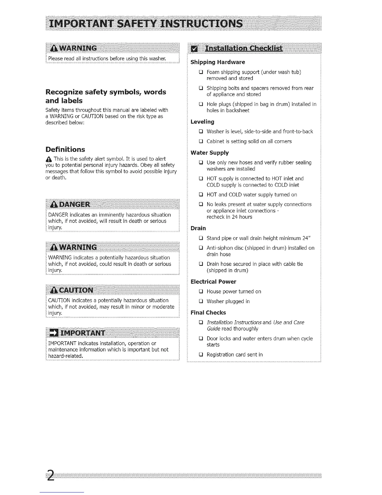 CAUTION indicates a potentially hazardous situation {3 Washer plugged in