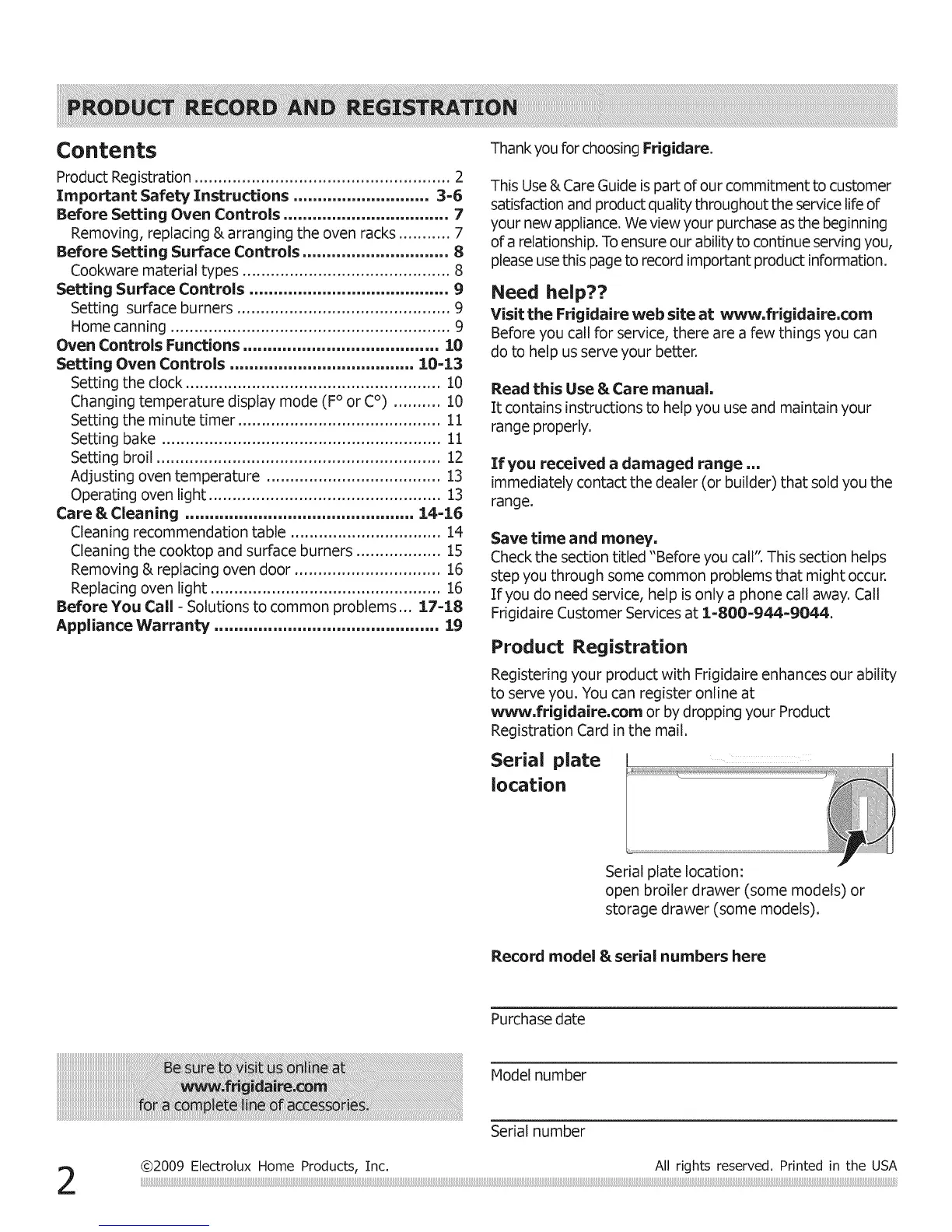 @2009 Electrolux Home Products, Inc. All ri0hts reserved. Printed in the USA