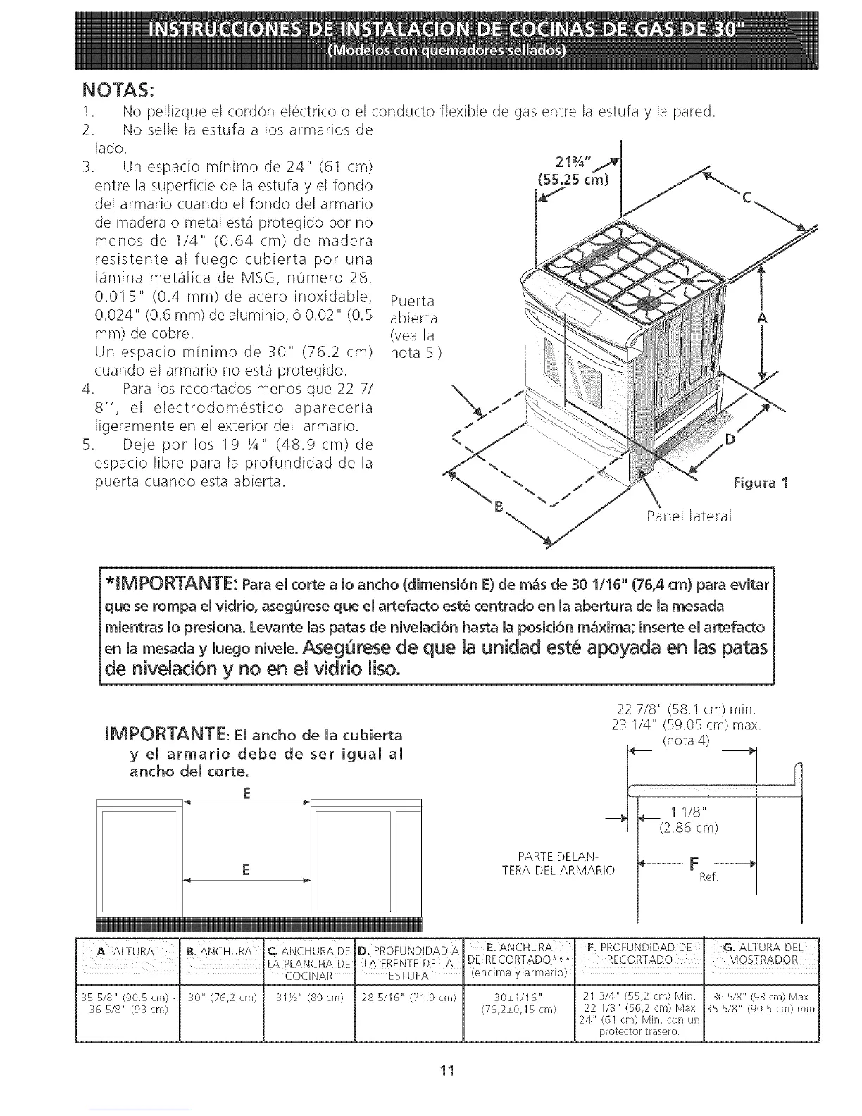 *IMPORTANTE: Para el torte a lo ancho (dimensi6n E) de m&s de 30 1/16 °°(76,4 cm) para evitar