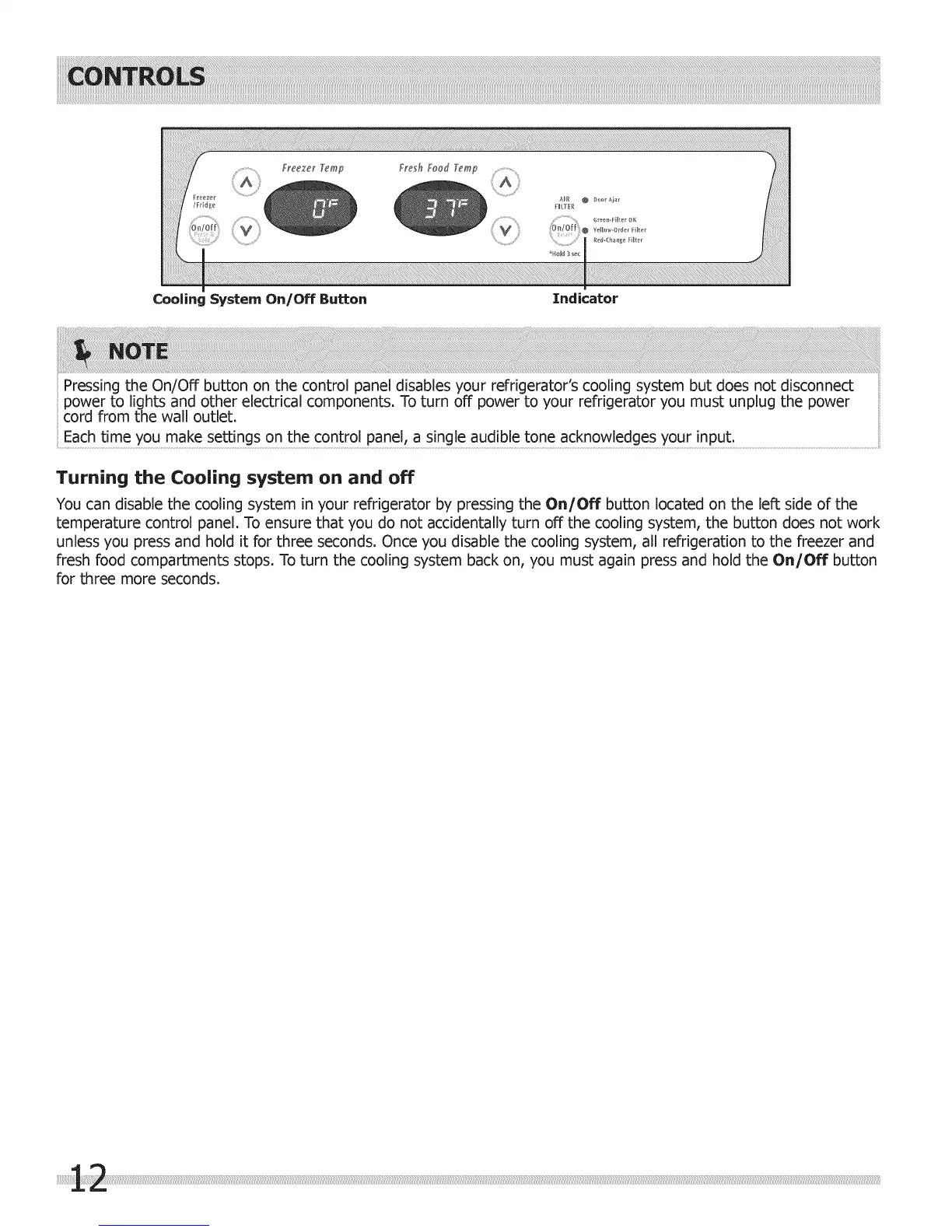 fresh food compartments stops. To turn the cooling system back on, you must again press and hold the On/Off button