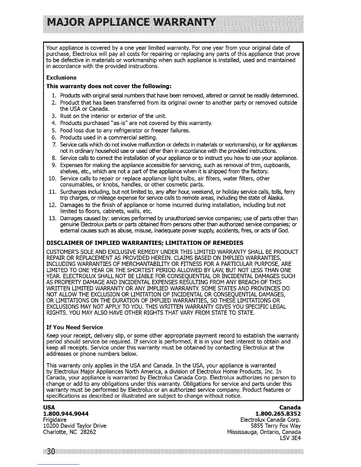 Canada, your appliance is warranted by Electrolux Canada Corp. Electrolux authorizes no person to