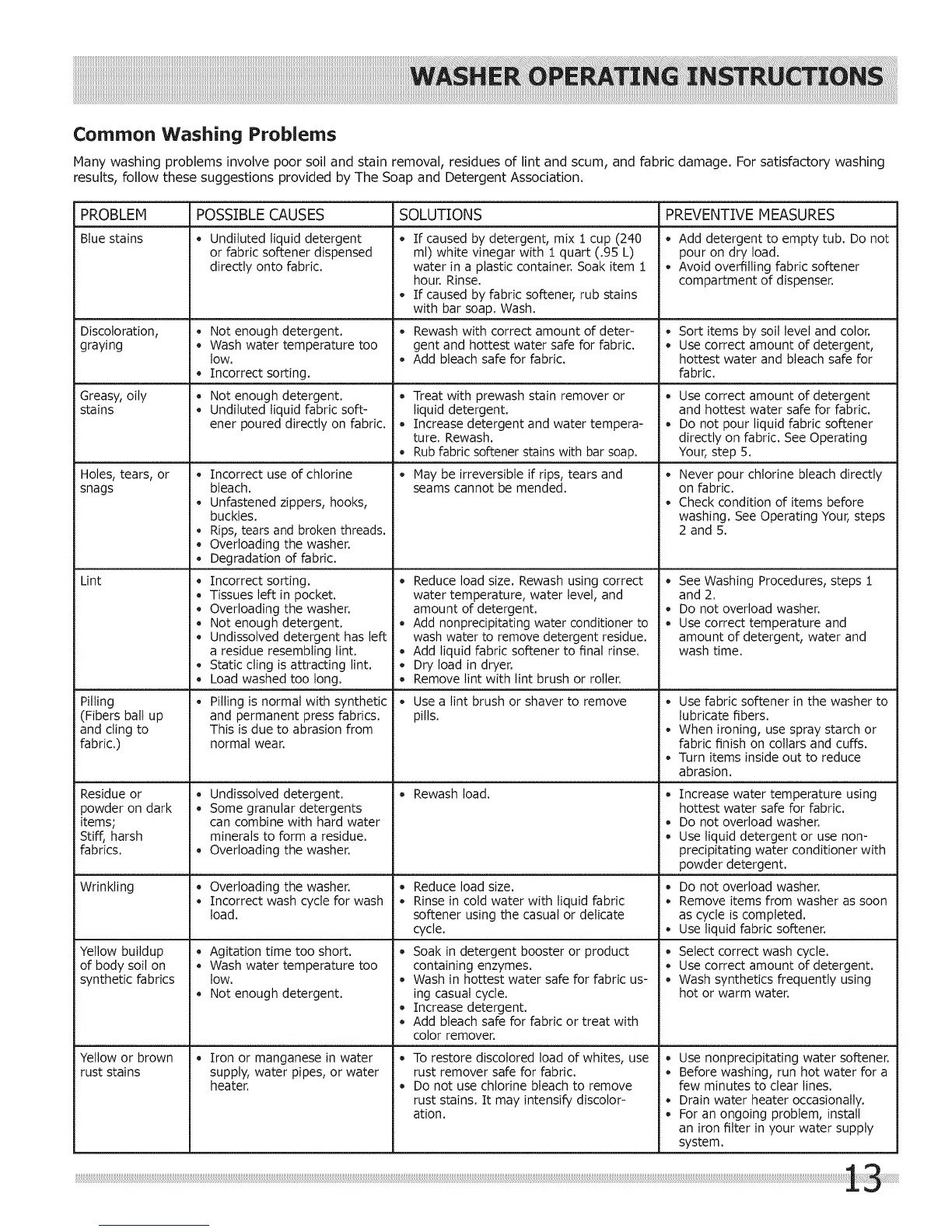 Many washing problems involve poor soil and stain removal, residues of lint and scum, and fabric damage. For satisfactory washing