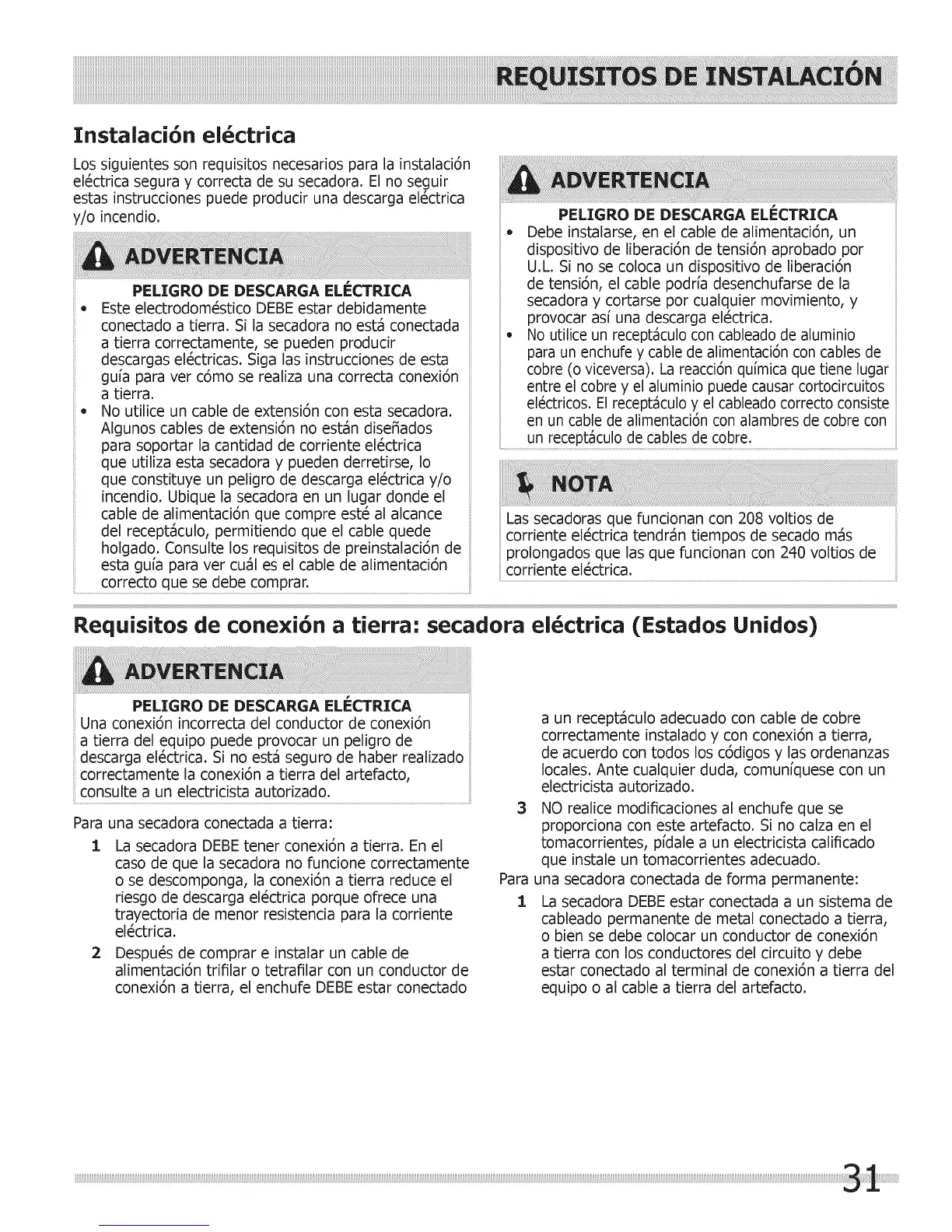 Requisitos de conexi6n a tierra: secadora ei ctrica (Estados Unidos)