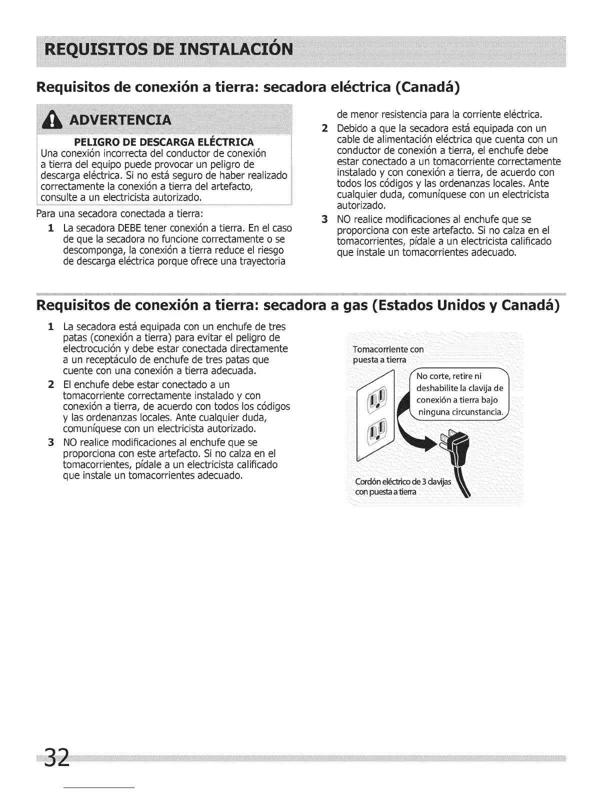 Requisitos de conexi6n a tierra: secadora a gas (Estados Unidos y Canada)