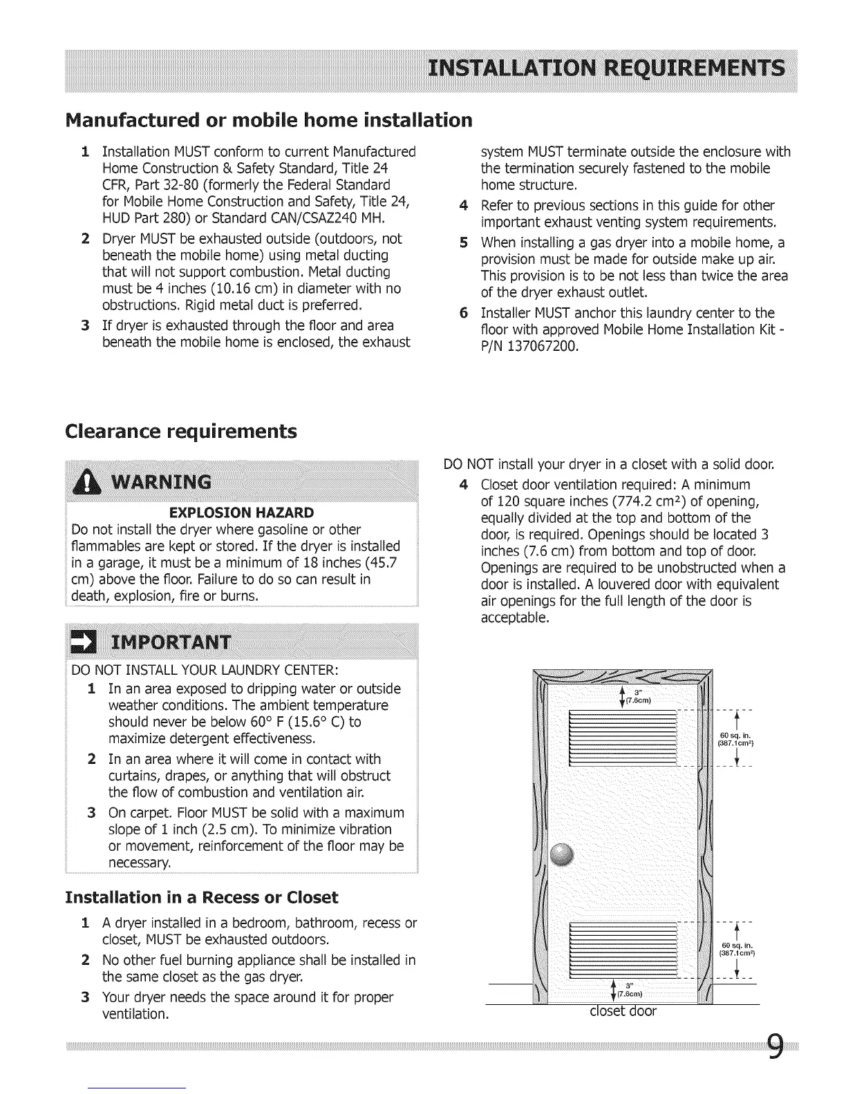 DO NOT install your dryer in a closet with a solid door.