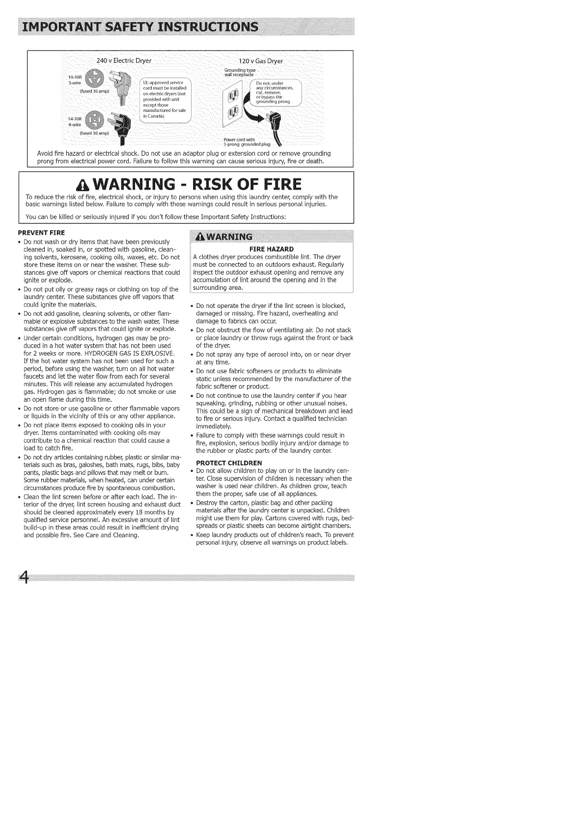 To reduce the risk of fire, electrical shock, or injury to persons when using this laundry center, comply with the