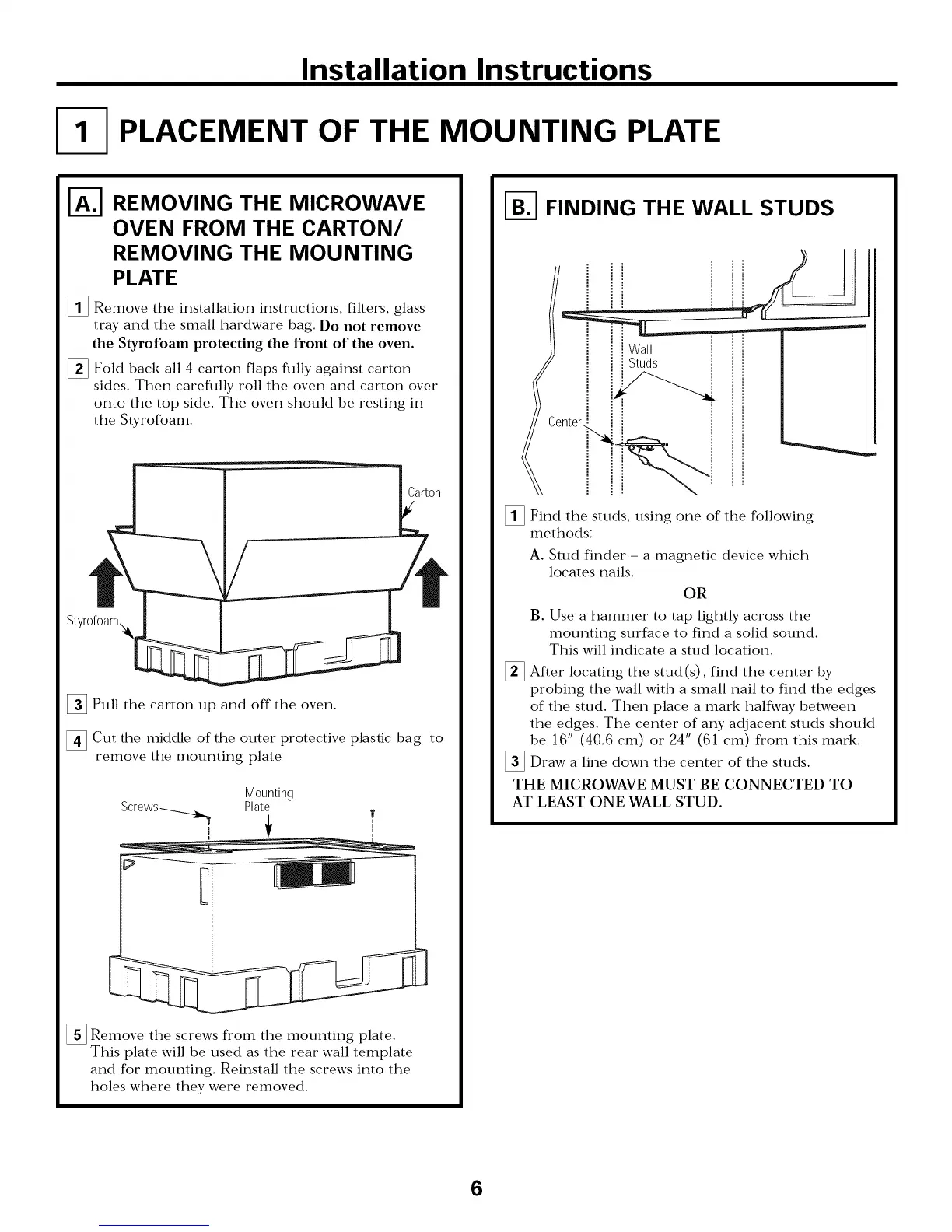 Frigidaire FFMV162LWA - Placement of the Mounting Plate; Removing the Microwave Oven and Mounting Plate; Finding Wall Studs