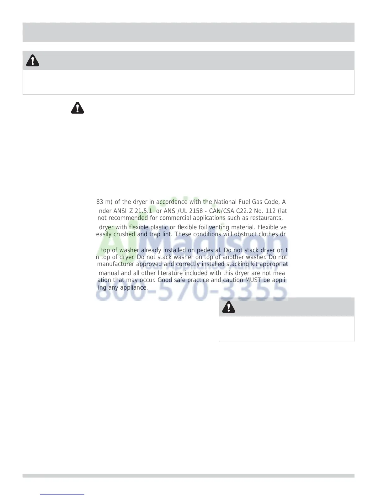 • Do not stack a dryer on top of washer already installed on pedestal. Do not stack dryer on top of another dryer.