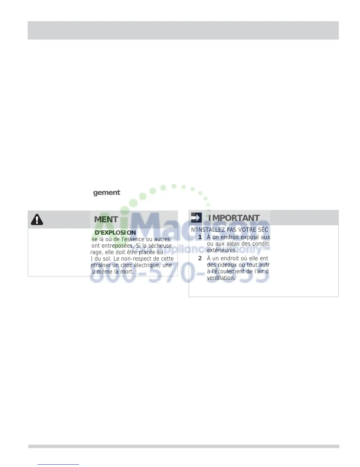 N’installez pas la sécheuse là où de l’essence ou autres