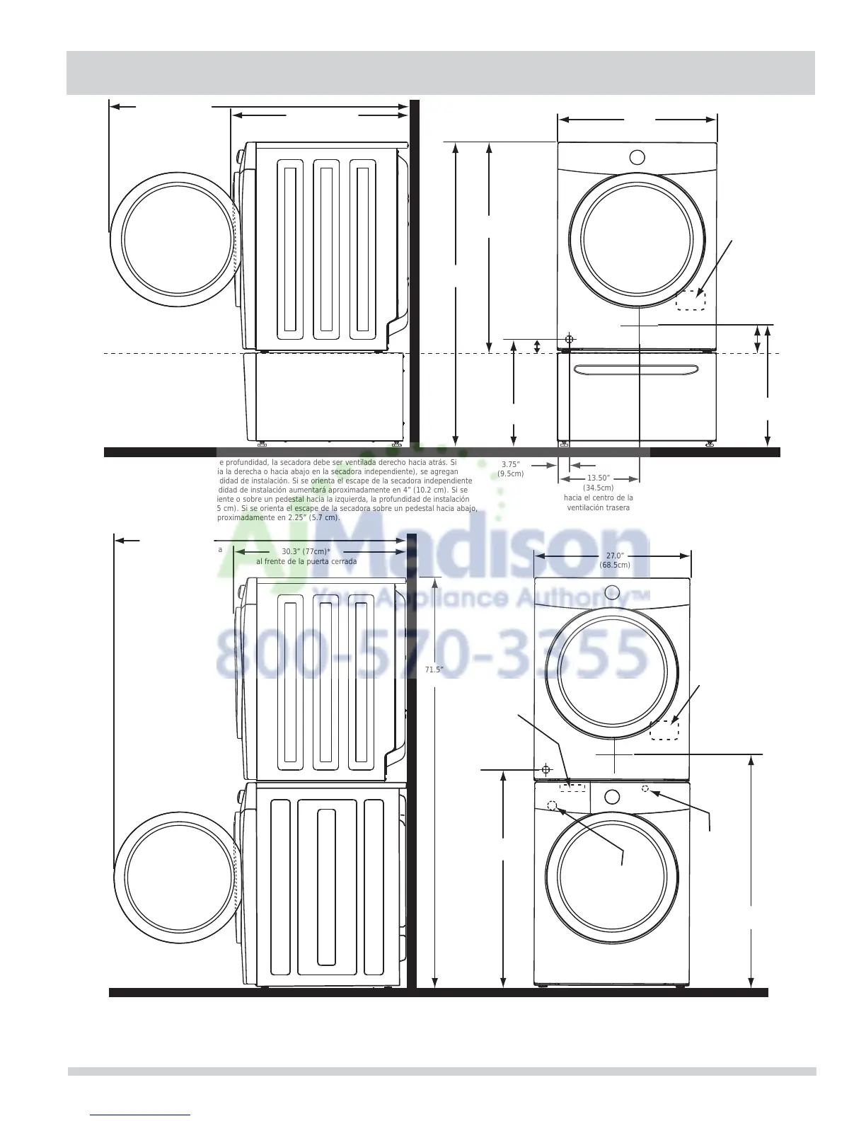 aumentará aproximadamente en 3.75” (9.5 cm). Si se orienta el escape de la secadora sobre un pedestal hacia abajo,
