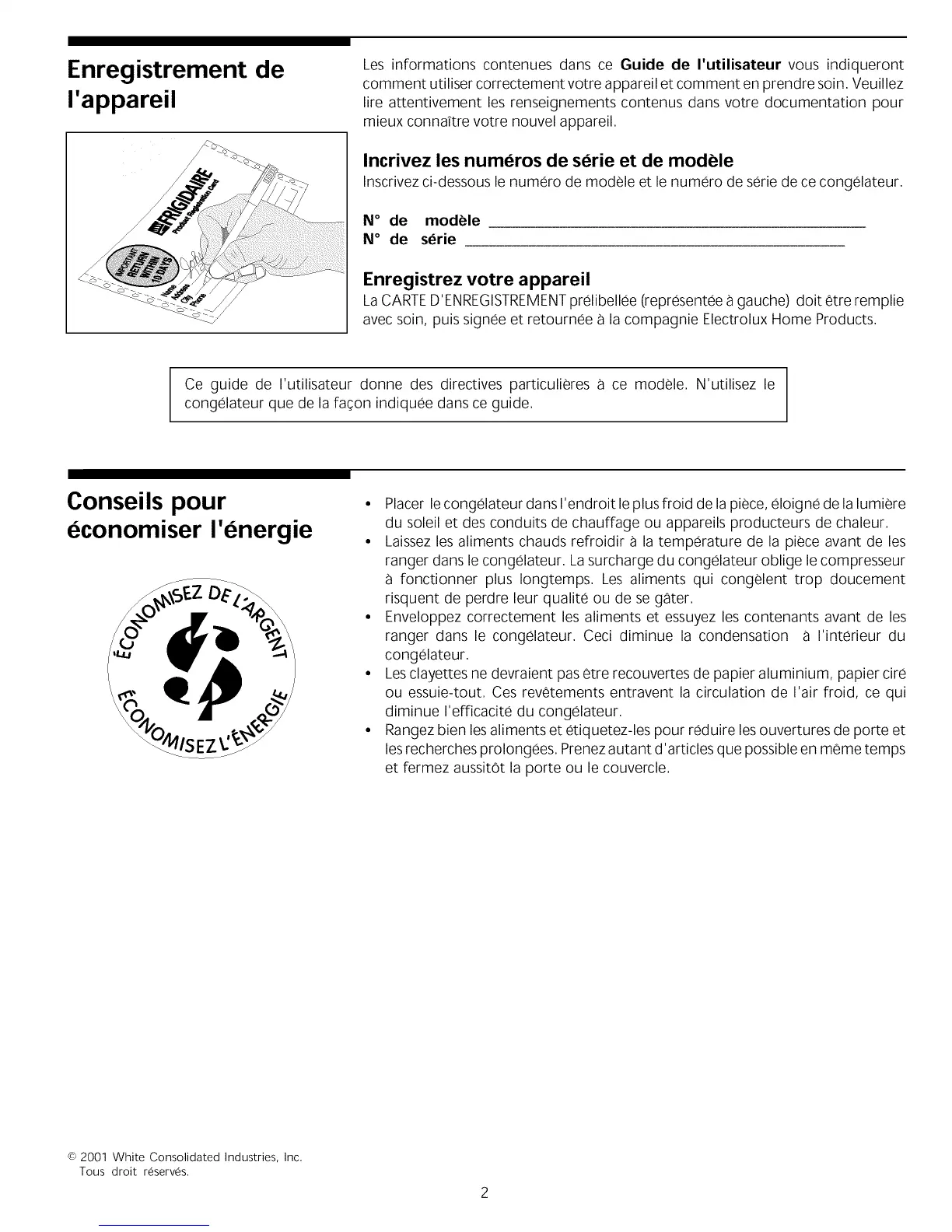 Inscrivez ci-dessous le numero de modele et le numero de serie de ce congelateur,