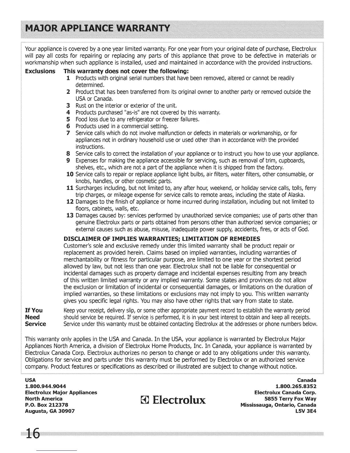 Appliances North America, a division of Electrolux Home Products, Inc. In Canada, your appliance is warranted by